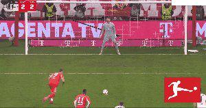 87’ 凱恩禁區(qū)內(nèi)被放倒,主裁判罰點(diǎn)球,凱恩主罰命中,拜仁將比分扳成2比2。